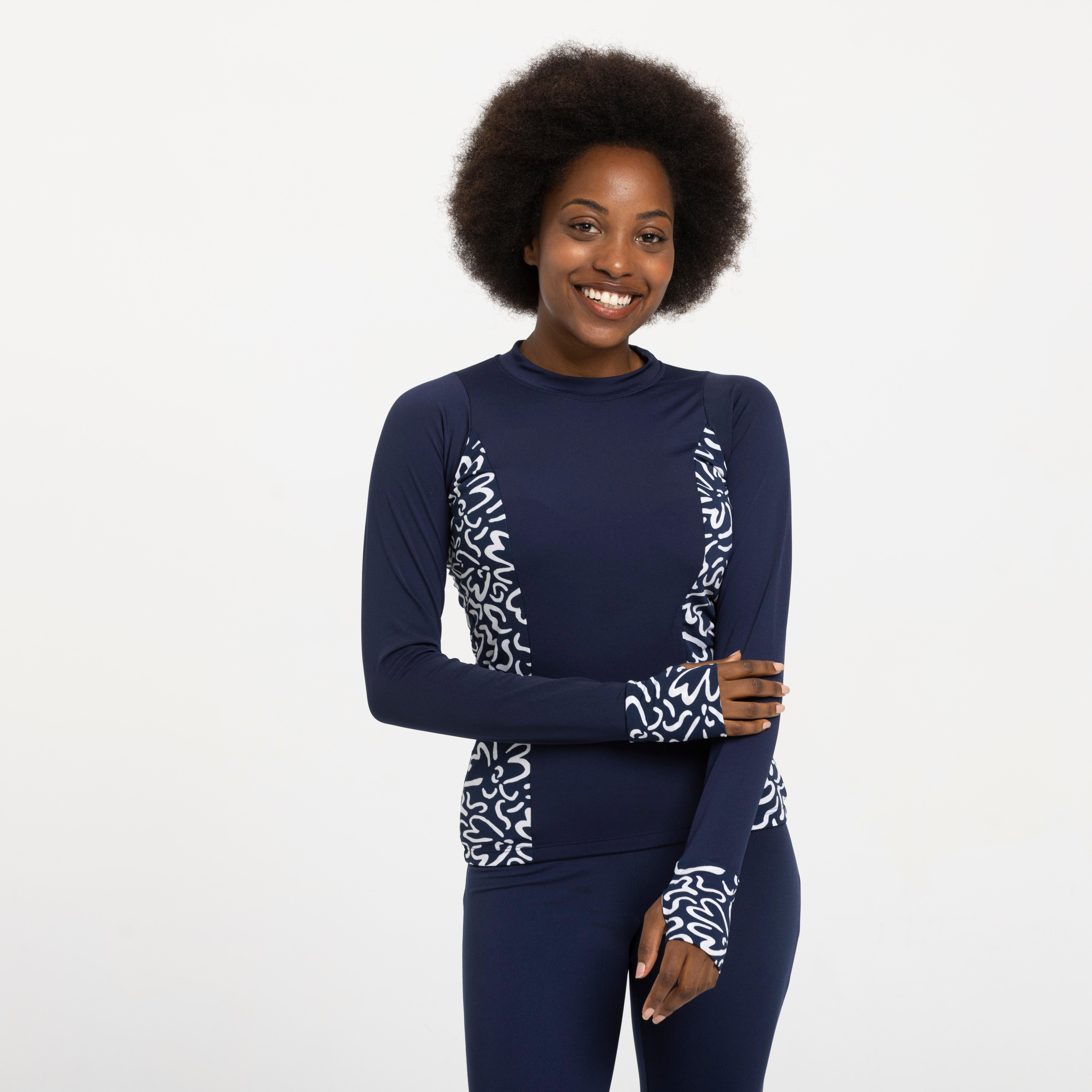 Avec sa matière ultra résistante au chlore, ses poignets empêchant les manches de remonter et sa brassière intérieure, ce top vous permet de nager confortablement .