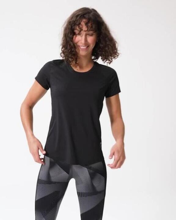 Avec sa coupe cintrée et ses détails techniques, ce T-shirt adopte un look sportif et féminin comme on l'aime ! En plus : sa matière légère et respirante est conçue pour les efforts.
